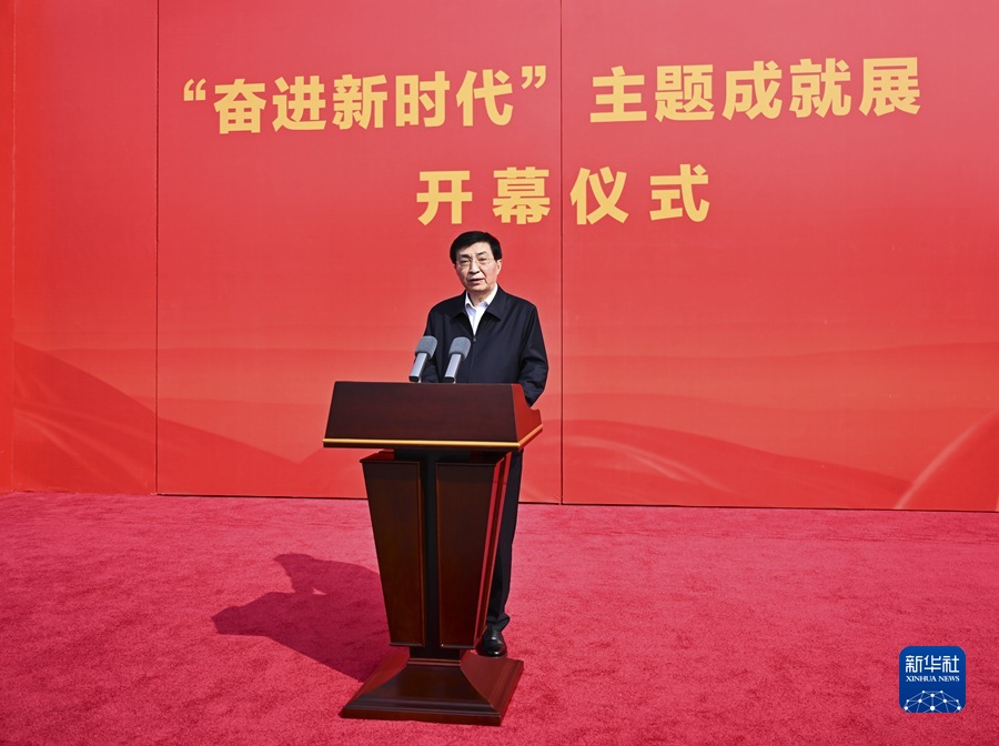 9月27日上午,“奋进新时代”主题成就展开幕式在北京展览馆举行。中共中央政治局常委、中央书记处书记王沪宁发表讲话并宣布展览开幕。新华社记者 燕雁 摄