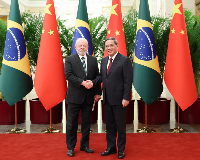 4月14日,国务院总理李强在北京人民大会堂会见来华进行国事访问的巴西总统卢拉。新华社记者 丁海涛 摄