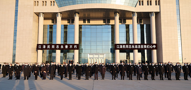 北京西郊机场国旗半垂,气氛庄严肃穆,黑底白字横幅上写着:“江泽民同志永垂不朽”“江泽民同志永远活在我们心中”。习近平和夫人彭丽媛等胸佩白花、臂戴黑纱,神情凝重地在停机坪肃立。