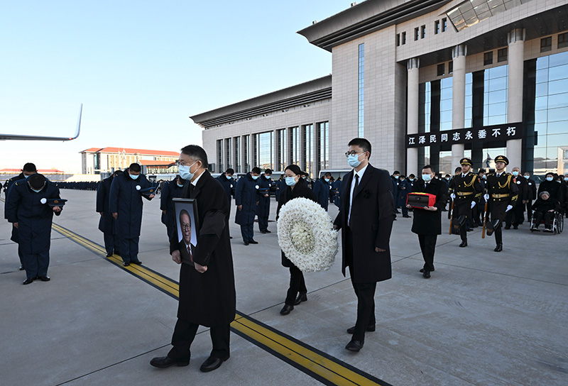 12月11日,遵照江泽民同志及其亲属的意愿,敬爱的江泽民同志的骨灰在长江入海口撒入大海。受党中央委托,中共中央政治局常委、中央书记处书记蔡奇等领导同志和江泽民同志的夫人王冶坪等亲属护送骨灰撒放。这是在北京西郊机场,江泽民同志的亲属捧着遗像、骨灰盒和花圈,缓步走向专机。新华社记者 燕雁 摄