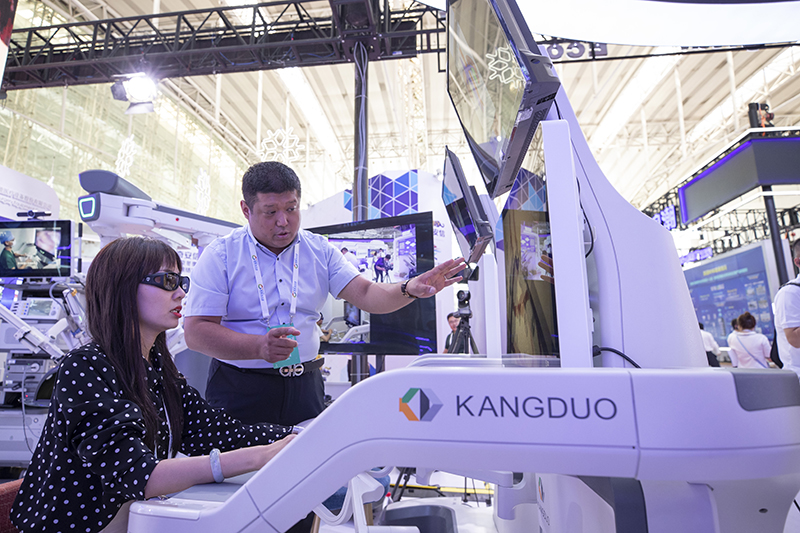 在黑龙江省哈尔滨市举办的2022世界5G大会展厅里,参展商现场演示5G远程手术机器人(2022年8月10日摄)。新华社记者 张涛 摄