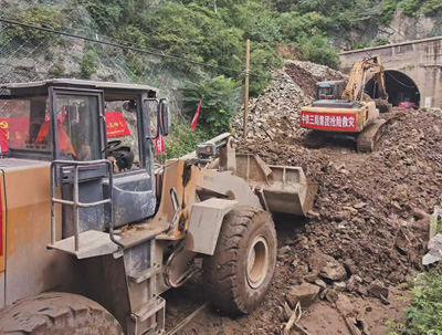 中国中铁三局救援队清理隧道洞口泥沙,抢修丰沙线。